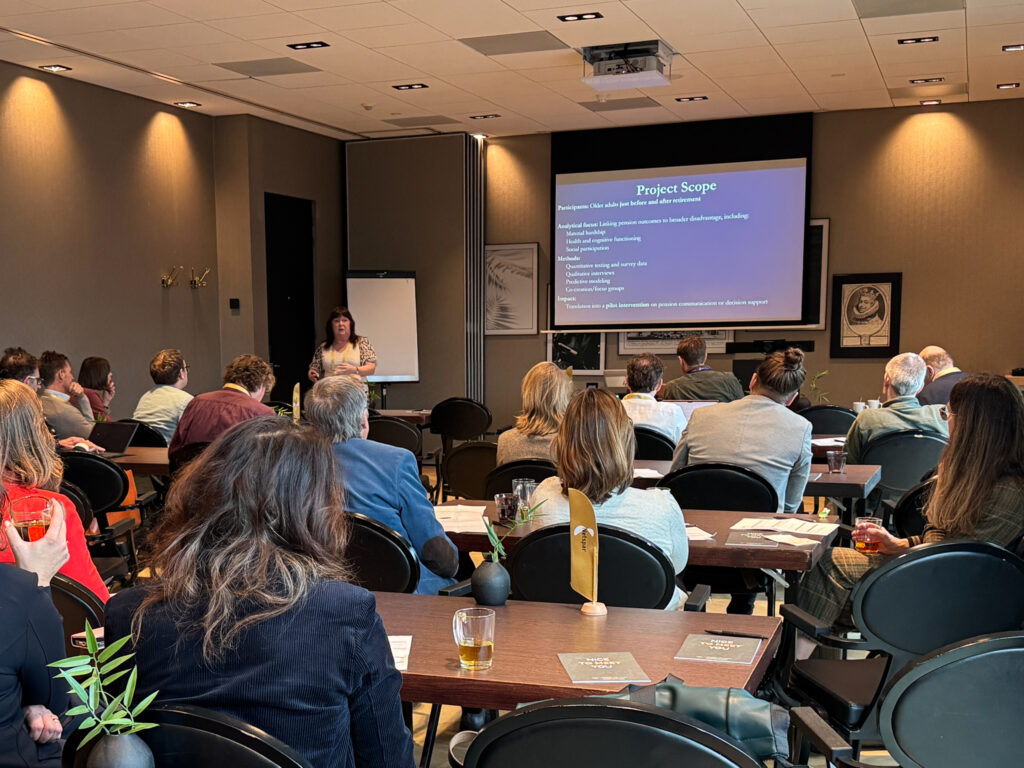 Pensioen en armoede onder ouderen stond bijvoorbeeld centraal in de presentatie van Ruth Mark van Tilburg University. Sanne Schulte-Koops en Franciska de Beer van Universitair Medisch Centrum Groningen presenteerden hun voorstel voor onderzoek naar de rol van menopauze in de genderpensioenkloof tussen mannen en vrouwen. Een ander voorbeeld is de presentatie van Bas Donkers. Hij ging in op de rol die generatieve AI kan spelen voor verbeterde communicatie en keuzebegeleiding.